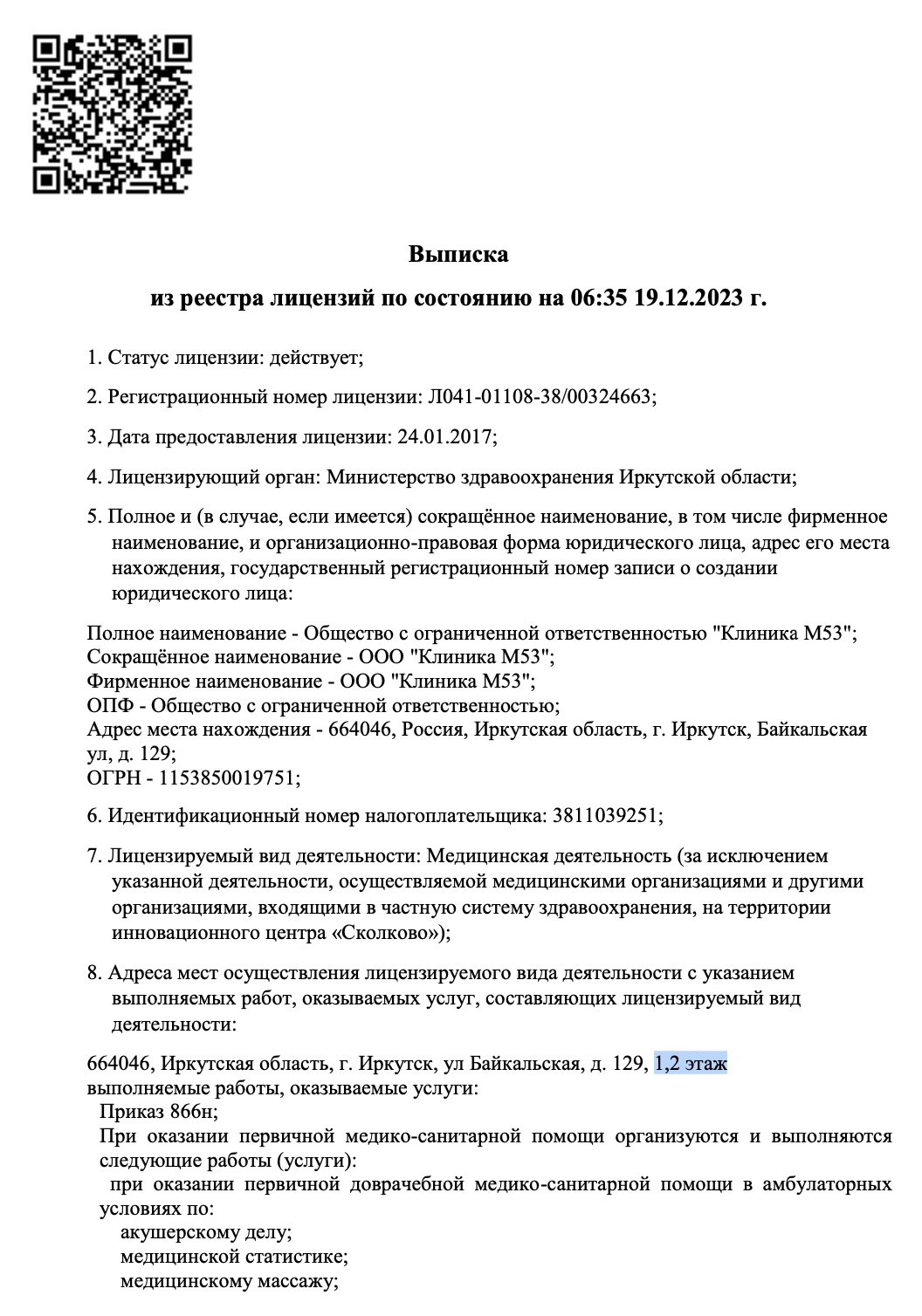 Общество с ограниченной ответственностью «Клиника М53». ИНН 3811039251 ОГРН 1153850019751. Выписка из ЕГРЮЛ
